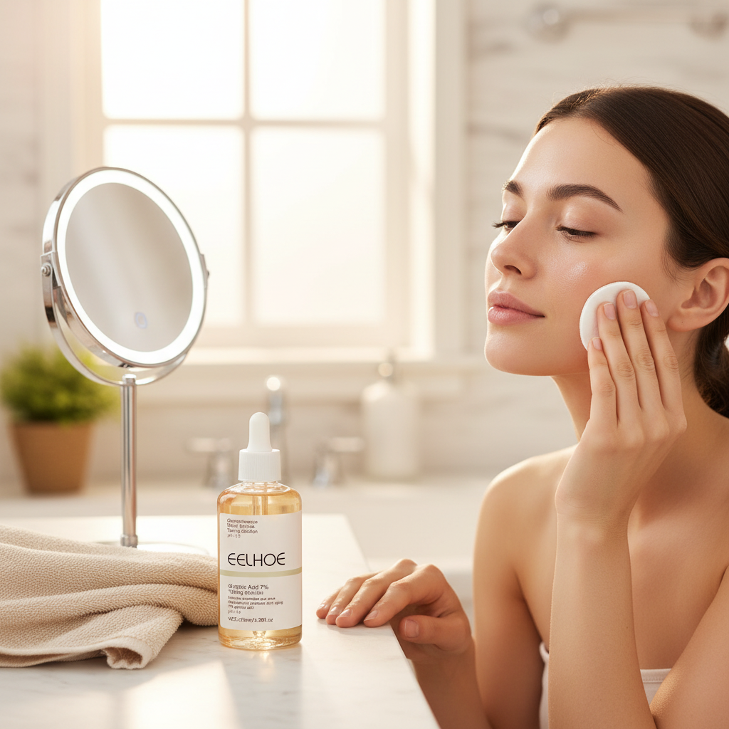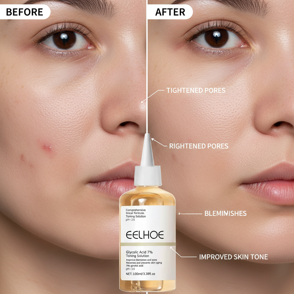 Notre tonique à l'acide glycolique 7% transforme votre peau: pores resserrés, acné éliminée, rides réduites. Éclat professionnel à domicile.